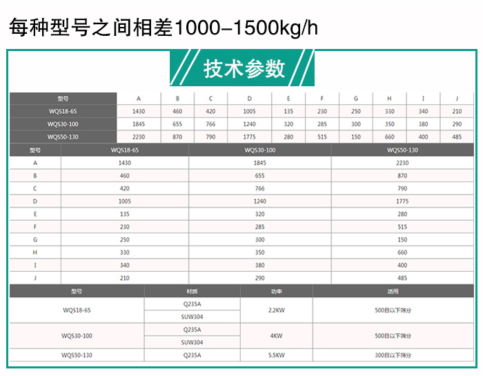蔬菜粉臥式氣流篩分為三種型號:WQS18-65,WQS30-100,WQS50-130,不同型號篩分過程中功率不同,產量也不相同,每種型號之間相差1000-1500kg/h,您可根據您的產量需求進行選擇