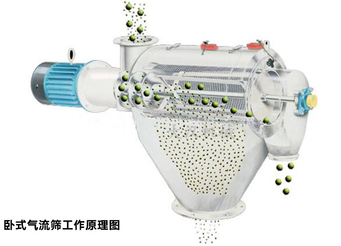 臥式氣流篩分機篩網為圓筒狀,置于機體內,物料通過螺旋輸送系統后,和氣流混合、霧化進入網筒內;通過網筒內風輪葉片使物料同時受離心力和旋風推進力,從而近使物料噴射過網,由細料排出口排出,不能過網的物料沿網筒壁從粗料排出口排出。