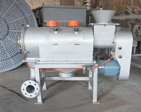 。其篩網(wǎng)為圓筒狀,置于機(jī)體內(nèi),物料通過螺旋輸送系統(tǒng)后,和氣流混合、霧化進(jìn)入網(wǎng)筒內(nèi);通過網(wǎng)筒內(nèi)風(fēng)輪葉片使物料同時(shí)受離心力和旋風(fēng)推進(jìn)力,從而近使物料噴射過網(wǎng),由細(xì)料排出口排出,不能過網(wǎng)的物料沿網(wǎng)筒壁從粗料排出口排出。